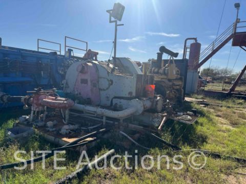 MUD PUMPS: 2-HTLZHTFC-1000 HP triplex mud pumps powered by 2 D-398 PC825 HP 1200 RPM diesel engine, 7-3/4 FSFE w/ OC caps, 3in. shear relief valve, 5ft. x 6in. centrifugal charging pump, 5000lb. pressure gauge, Pulsation damper