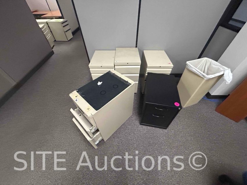5 file cabinets, 2 trash cans, 1 table, 1 table