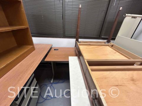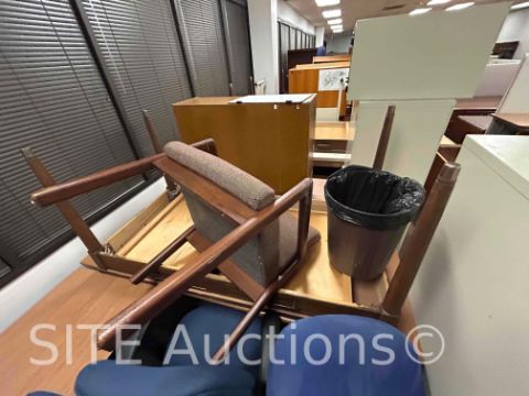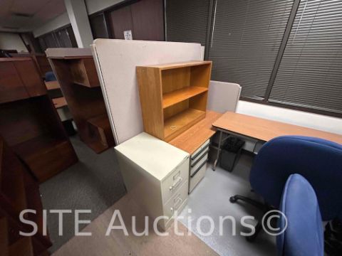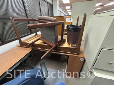 14 Desks, 5 Chairs, 7 Bookshelves, 8 Cabinets, 1 Cubicle Partition, All Trashcans Included