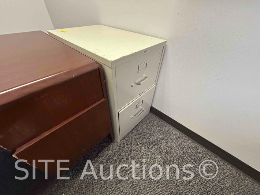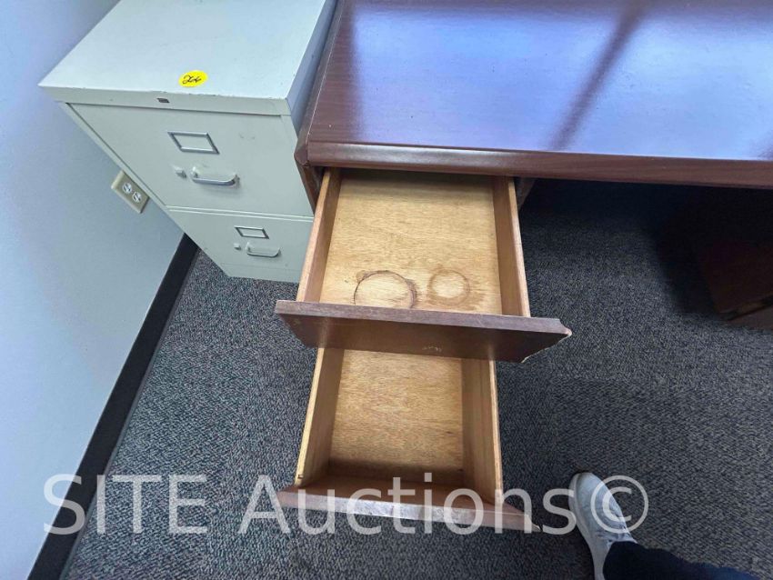 3 desks, 2 filing cabinets, 2 chairs