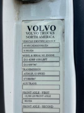 Volvo D11 Diesel engine, 425 HP, GVWR 53200, 13200 fronts, 40000 rears, A/T, A/R Susp, Sleeper, 452325 miles, VIN: 4V4WC9DH3JN901524