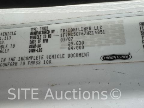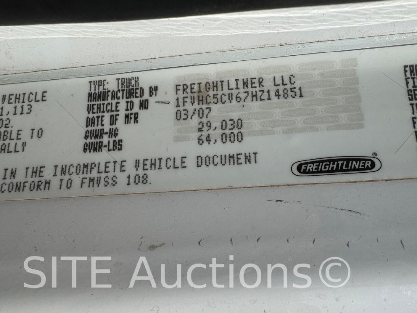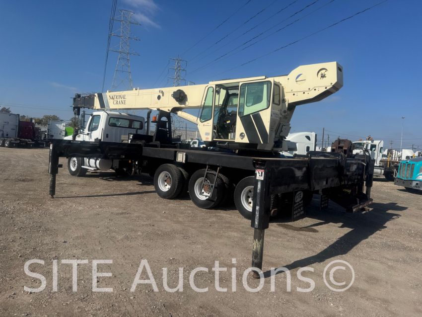 Mercedes-Benz MBE4000 Diesel engine, Eaton Fuller 10 Spd, A/R Susp, Chelsea PTO, National Crane 1500 S/N: 295835, Annual inspection good through Sept. 2026, 127ft 5-section boom, 36 ton capacity, Johnson Blocks 20 ton block, Additiona; 3 sheave block, Outriggers, GVWR 84000, 7700 hours, 40000 miles, VIN: 1FVHC5CV67HZ14851