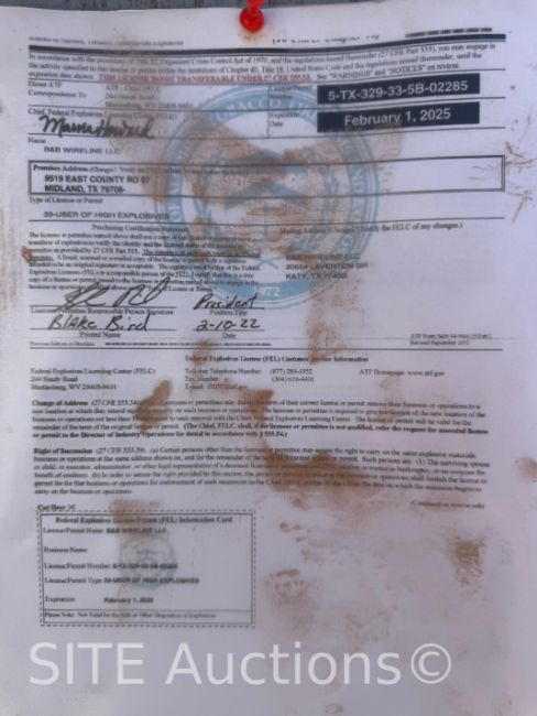 Auctioneer will invoice all items at close of sale. All payments are due within 3 business days. Any payment not received will be charged to card on file three business days after the sale concludes without written arrangement with auctioneer. Buyer's Premiums: 11% for items selling for $2500 and below, 6% for all items selling for more than $2500. An additional 2% internet platform fee will be applied to all items sold online. Should Purchaser fail to pay in full for all Auction Items) within 3 business days following the date of Sale, Purchaser shall remain fully responsible for the purchase price therefor and the buyer's fee applicable thereto. In addition to all other rights of Auctioneer contained herein, if a default occurs and Purchaser has not made full payment by the 3rd business day following the date of Sale, Auctioneer may, in its sole discretion, elect to: (a) charge a 2% late fee and, for so as long as the default continues to occur, all outstanding financial obligations shall bear interest at the interest rate of 2% per month (the "Default Interest Rate"). The Default Interest Rate shall apply from the date of the default through the time any judgment thereon is paid in full; or (b) declare any Auction Items) for which full payment has not been received a "No Sale" and charge a 20% restocking fee with respect to each such Auction Item equal to the greater of (i) 20% of the applicable sale price for the Auction Item or (ii) $250. There is a 3% processing fee for all transactions. Those paying with cash, check, wire transfer, ACH, or money order will not incur the fee. There is a $50 title fee on titled items. All buyers need to furnish all resale certificates and Texas resale exemption forms if dealers. All out of state buyers who are not dealers must furnish bills of lading from a common carrier to not be charged sales tax. All export buyers must furnish dock receipts and bills of lading to not pay sales tax. The State of Texas will issue Farm Exemption Numbers for Farm Exemption for residents of Texas. 8.25% sales tax. THIS CATALOG IS MEANT MERELY AS A GUIDE WITH NO WARRANTIES OR GUARANTIES EXPRESSED OR IMPLIED. ALL ANNOUNCEMENTS BY THE AUCTIONEER SHALL SUPERSEDE ANY PRINTED MATERIAL. LOAD OUT Security will not allow the removal of purchases without a release ticket. The office will assist you with release tickets for your transportation company on the items purchased at this auction. The purchaser will be charged $25 per item, per day storage on any item that has not been removed after 10 days, plus any costs associated with relocating the items. Load out is Monday thru Friday 8-4 and on weekend days as noted. Items will be considered abandoned if they are not removed by buyer within 21 days of the auction. BUYERS RESPONSIBILITIES All descriptions are made in good faith, but it is the buyer's sole responsibility to inspect items. Items become the sole responsibility and property of the purchaser when auctioneer completes the sale of the item when the bid is accepted by the auctioneer. Possession will be obtained upon proper settlement. Purchaser will be responsible for the removal, insurance, breakdown, arranging, shifting, loading, and securing of load for any items purchased. SITE Auction Services does not arrange or contract freight for buyer's items unless agreed upon by both parties. It is the buyer's responsibility to have inspected the item and determined the condition, year, model, serial number and mileage of the item from their inspection. All persons in attendance at this auction must be an adult. No one under 18 will be allowed on auction premises without adult supervision. No minors are permitted to bid in any auction. SITE Auction Services is providing internet pre-auction and live bidding as a service to Bidder. Bidder acknowledges and understands that this service may or may not function correctly the day of the auction. Under no circumstances shall Bidder have any kind of claim against SITE Auction Services or anyone else if the internet service fails to work correctly before or during the live auction. SITE Auction Services will not be responsible for any missed bids from any source. Internet bidders who desire to make certain their bid is acknowledged should use the proxy-bidding feature and leave their maximum bid 24 hours before the auction concludes. SITE Auction Services reserves the right to withdraw or re-catalog items in this auction. SITE Auction Services reserves the right to refuse a bid at any time. Any dispute must be adjudicated in Montgomery County, TX. By registering for this auction, the buyer agrees to all terms of sale listed herein and to adhere to the Proxibid Unified User Agreement. Kenneth Russell Spicer III TX License: 17850